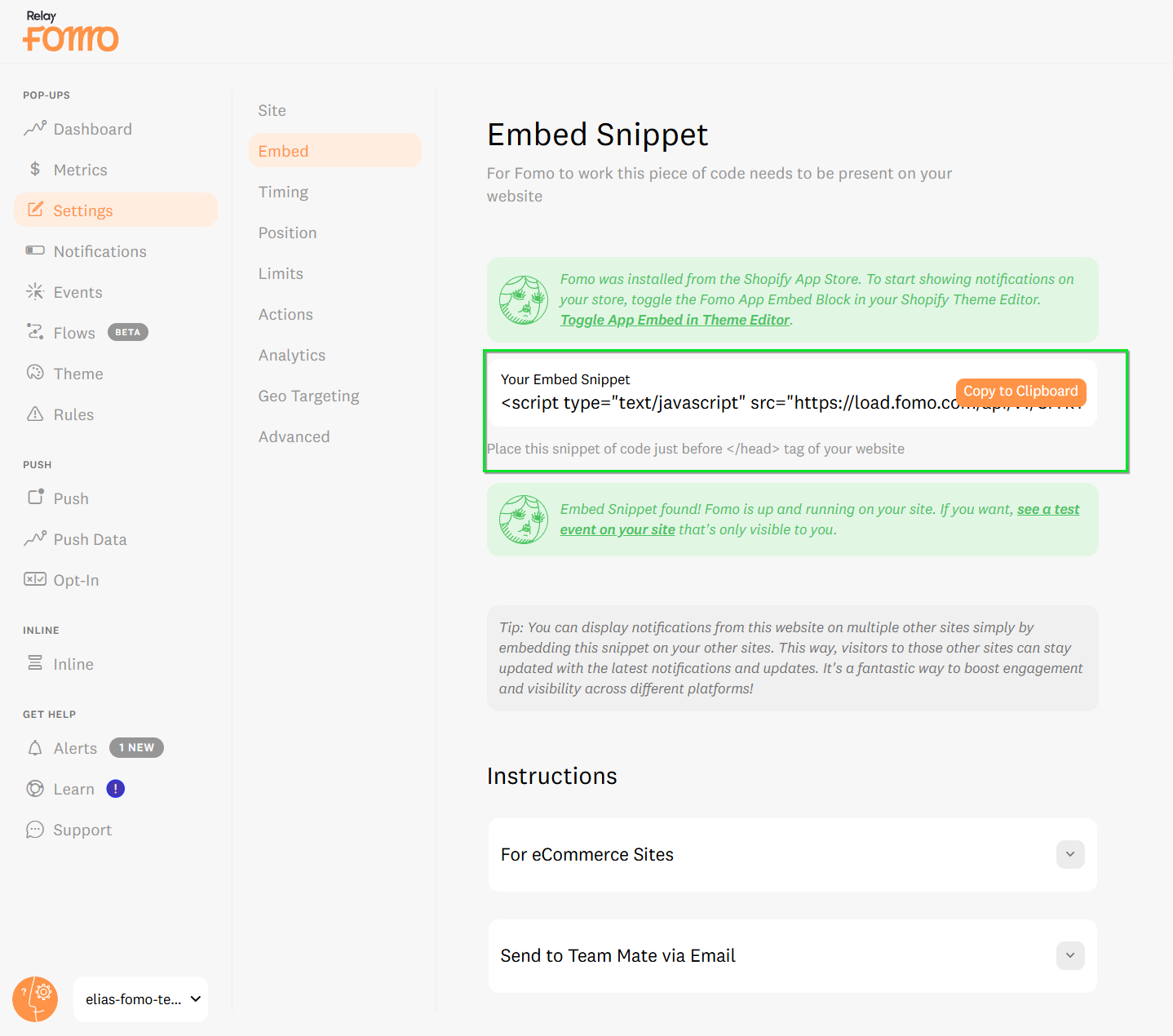 Inside Fomo, navigate to Settings > Embed. Copy the string of characters located between /api/v1/ and /load.js in your snippet. This is your unique ID keep it handy!