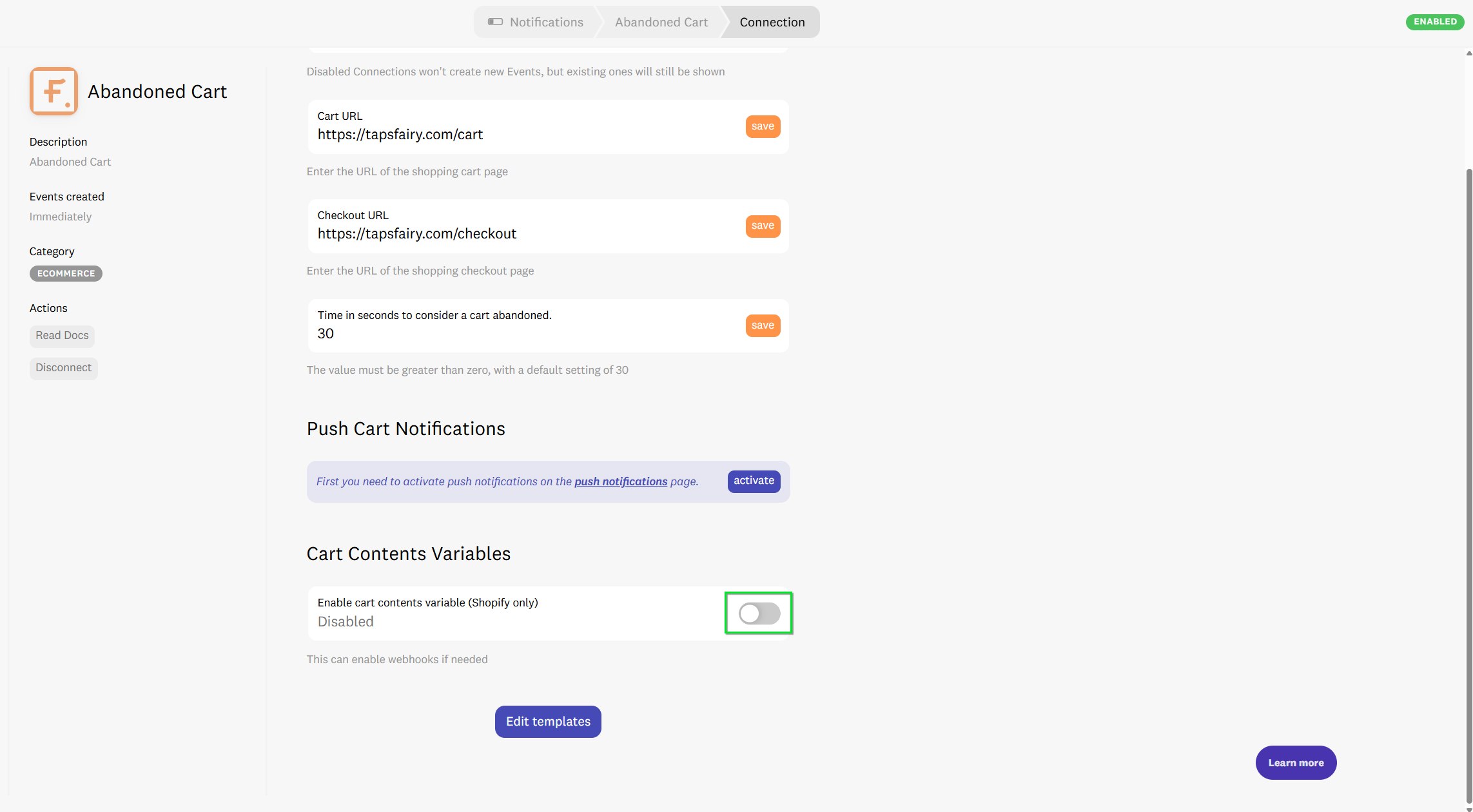 How to enable it: Inside your Abandoned Cart settings, look for the toggle button: "Cart Contents Variables>Enable Cart contents variables(Shopify only)" Switch this ON to start displaying exactly what the customer left behind.