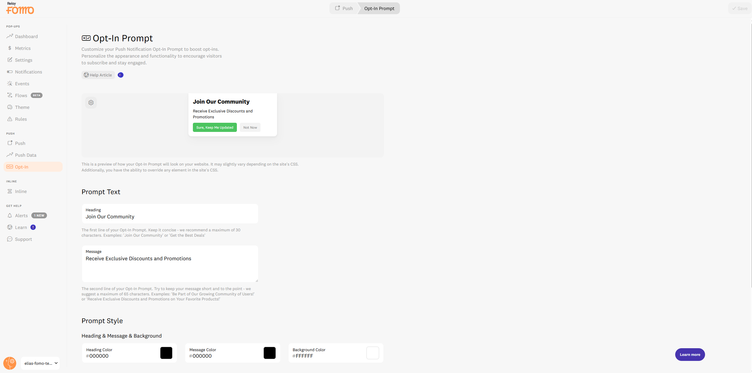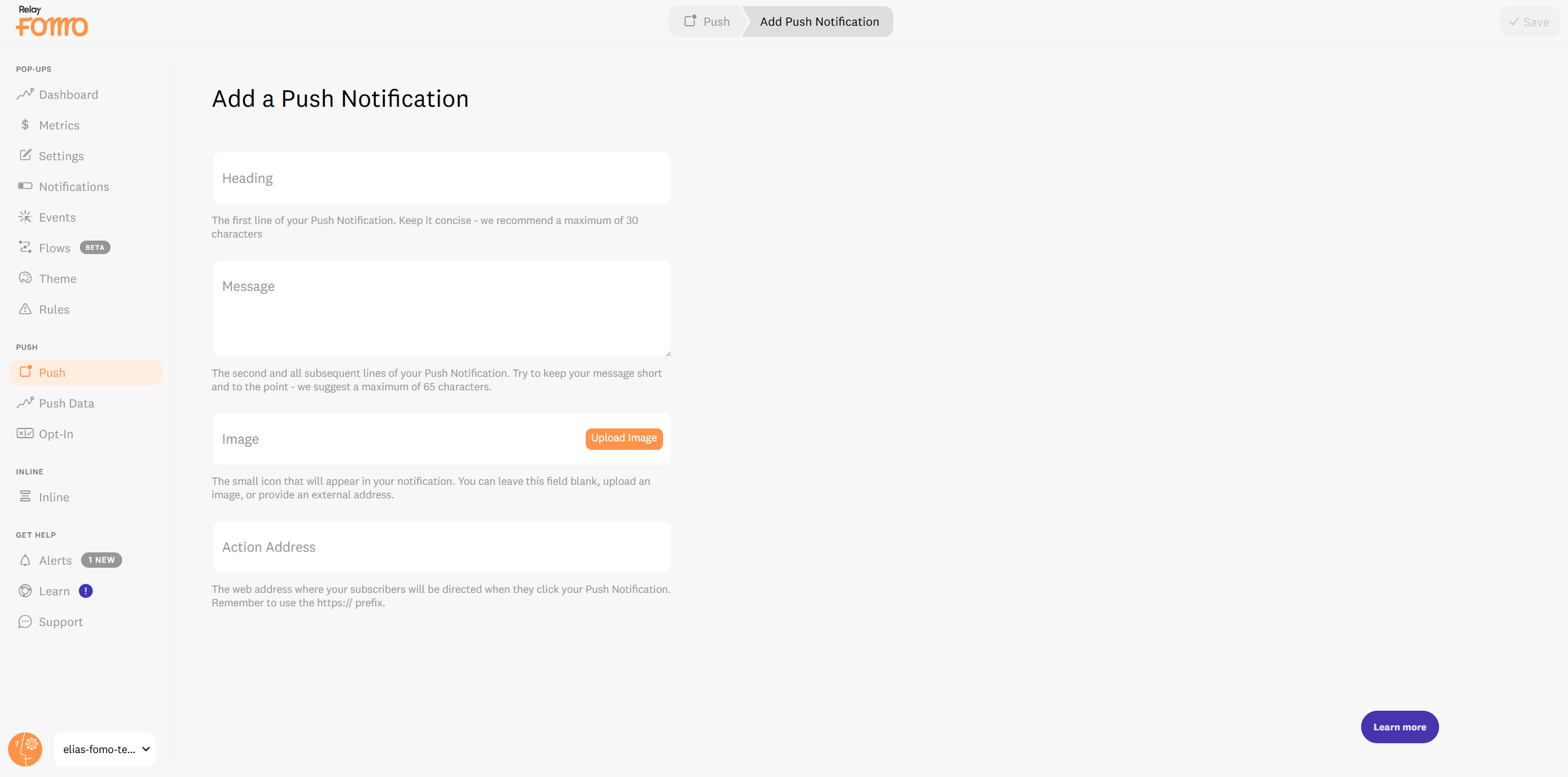 Navigate to Push Notifications in Fomo.