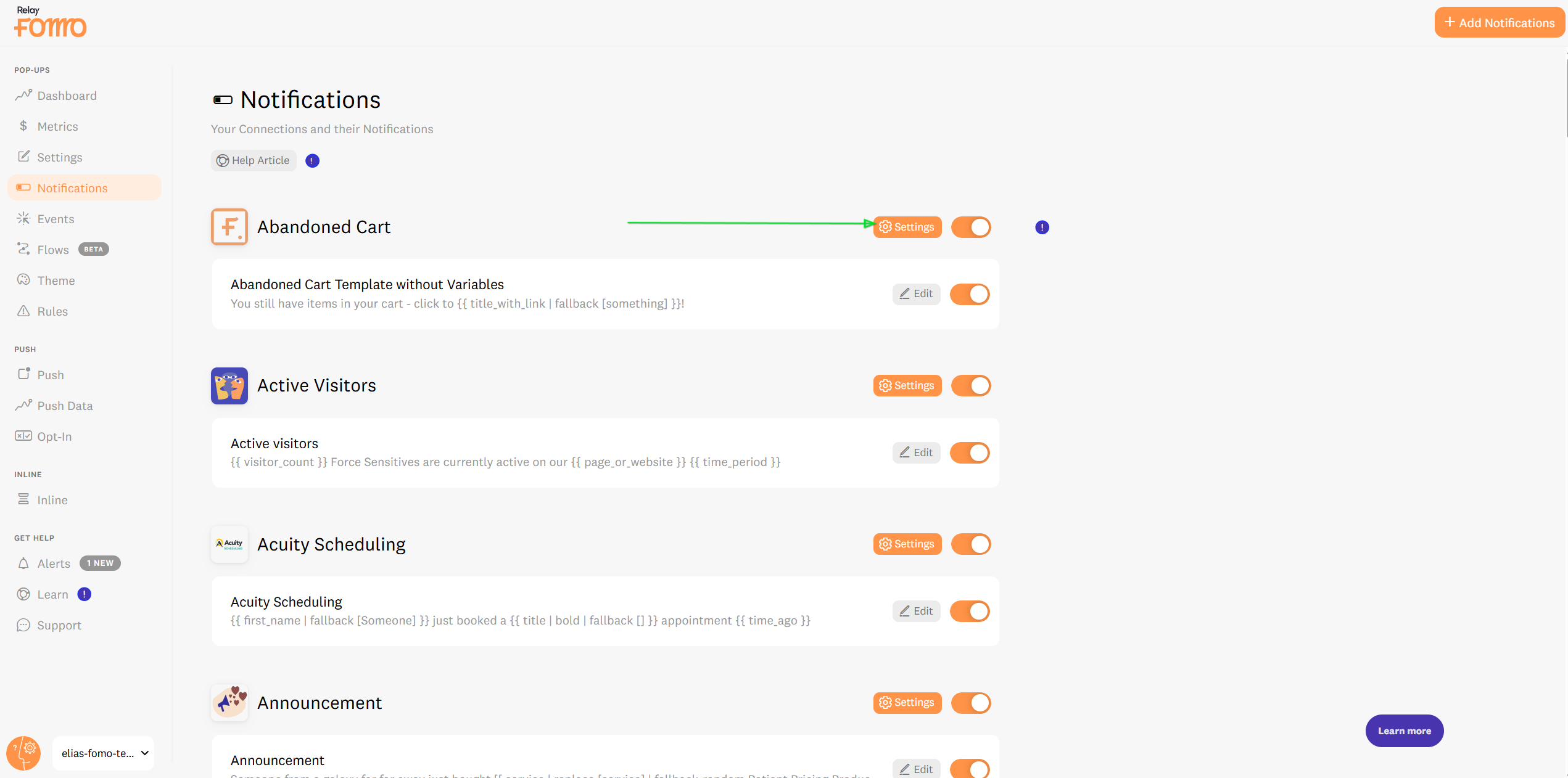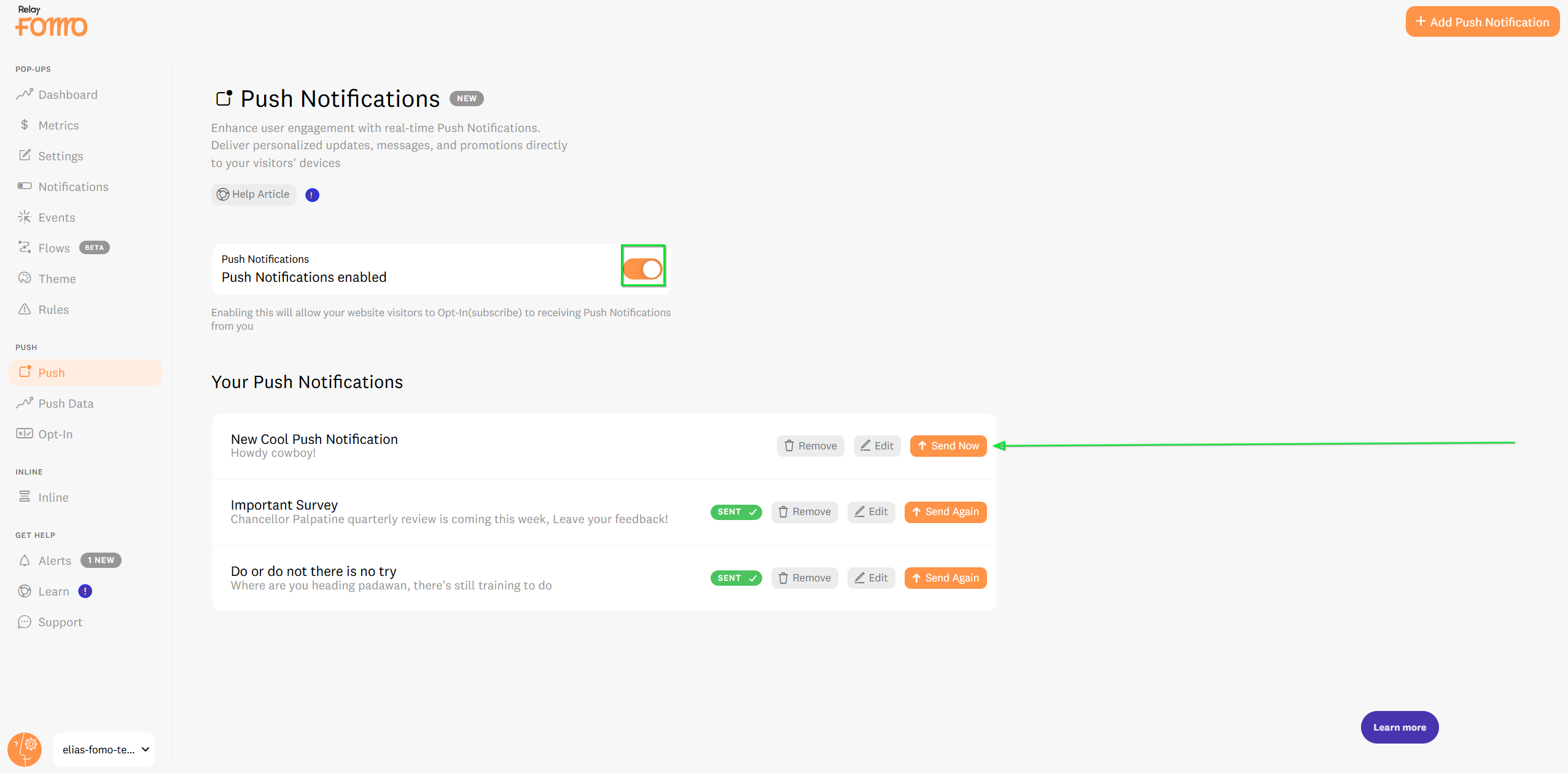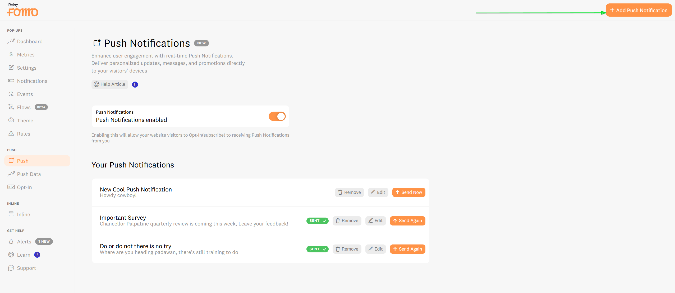 - Simply navigate to Push Notifications in your Fomo dashboard to toggle them on.
