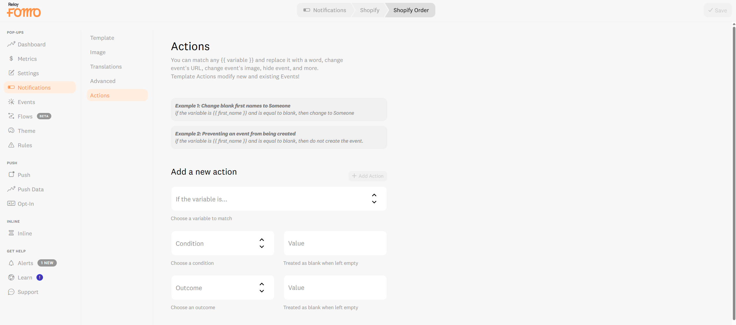 Define the Action: Choose what Fomo should do (e.g., Don't create notification or Change value to...).