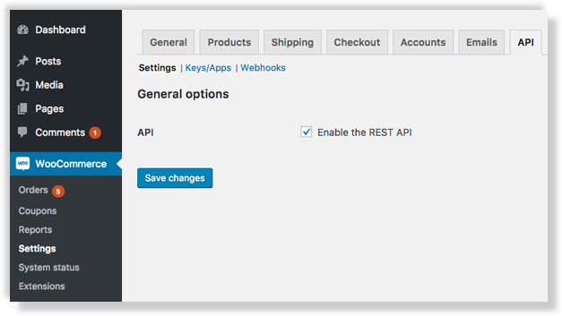 API Tab: If you see this tab, click it and ensure the 'REST API' checkbox is enabled from the 'Settings' sub-tab. Then, click 'Keys/Apps.'