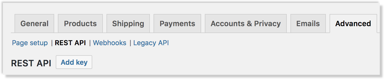 Depending on which version of WooCommerce you're currently running, you'll see either an "API" tab or an "Advanced" tab. Both lead to the same result, but the path is slightly different: