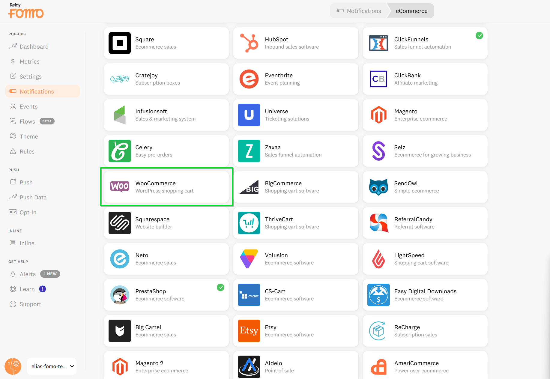 Navigate to the Notifications tab > +Add Notifications > eCommerce and select WooCommerce.