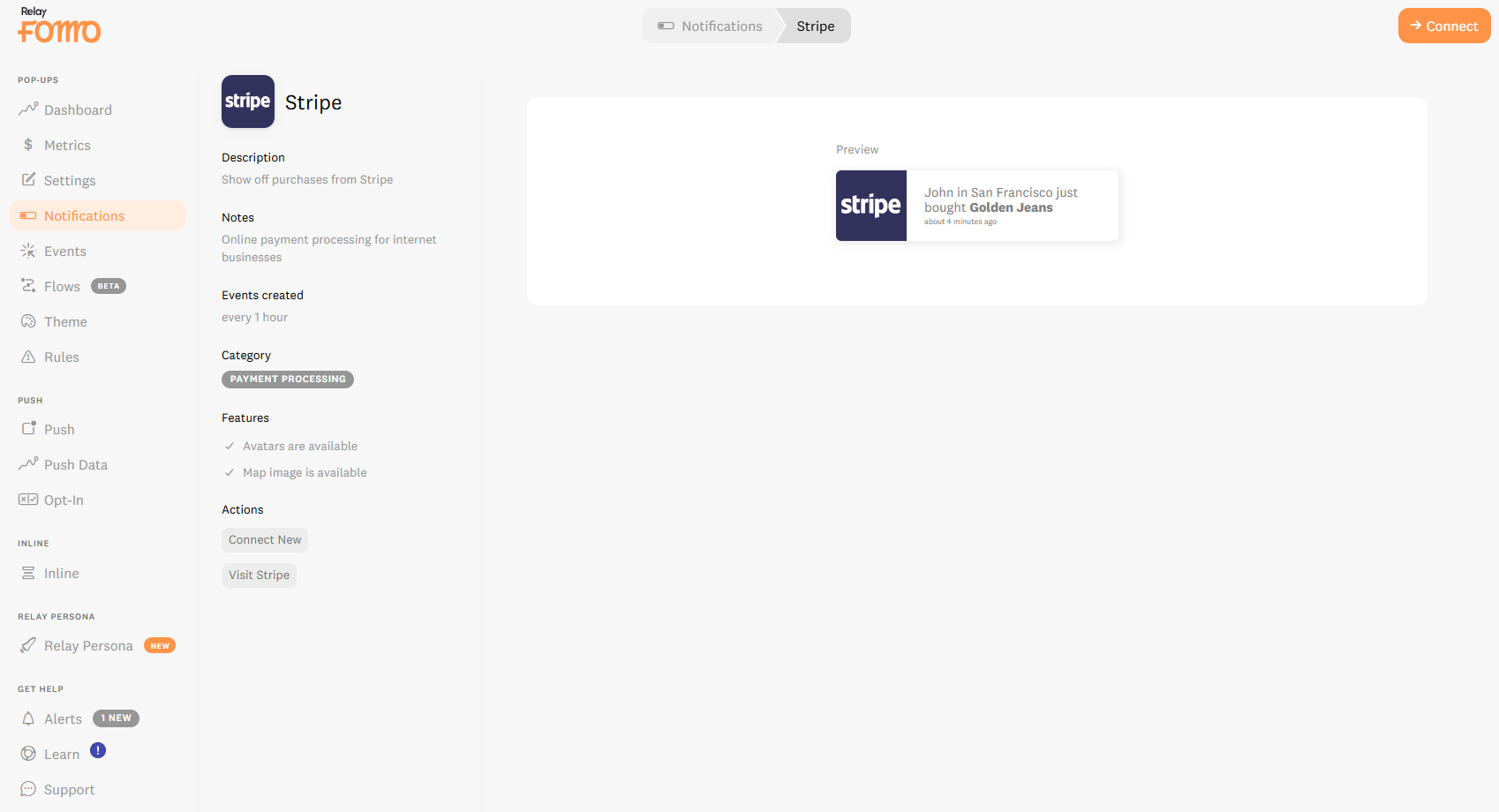 Once connected, Fomo will begin pulling in live sales data from Stripe to generate notifications.